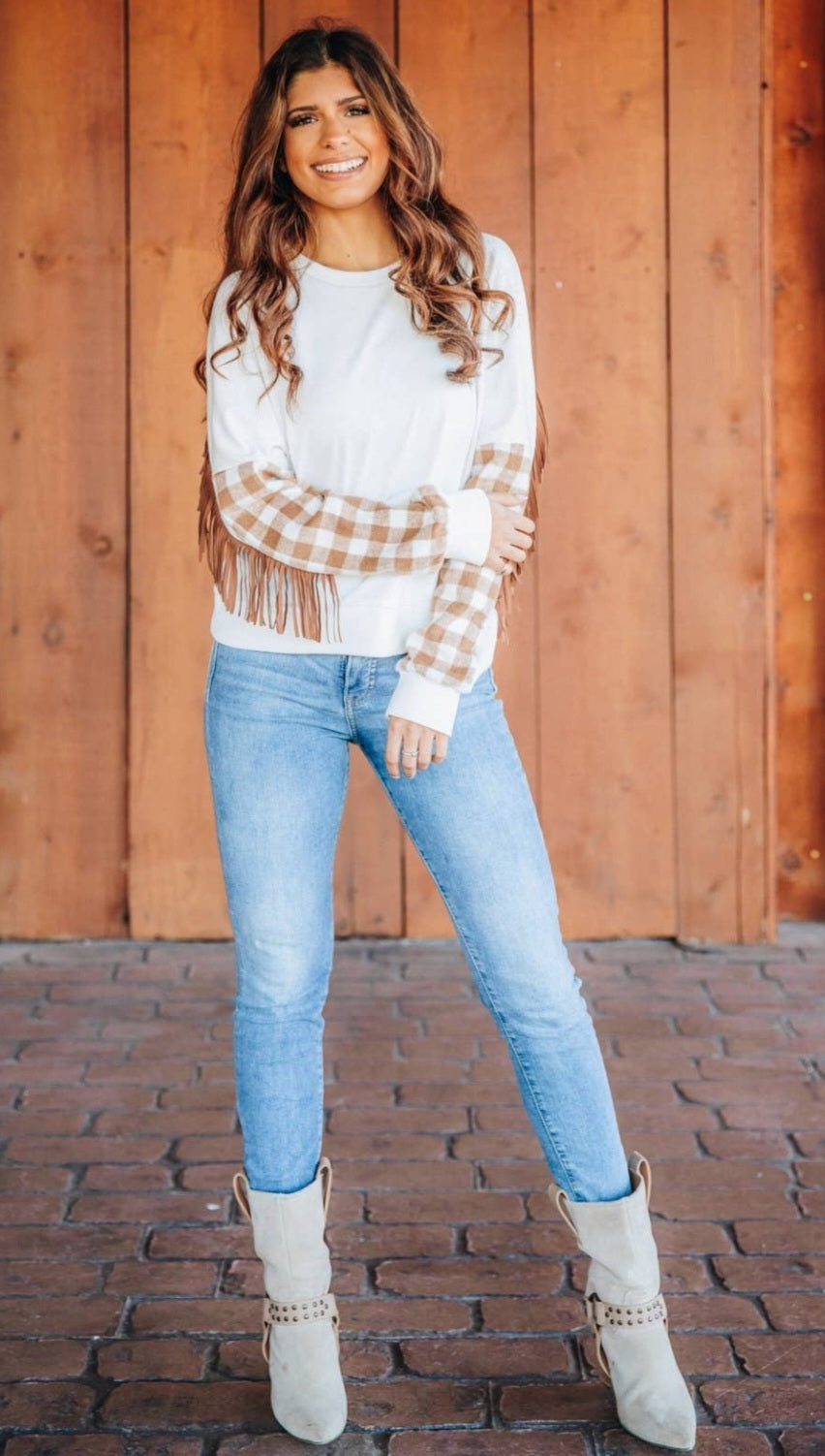 The sweater of your dreams is here! The white color give this top a fresh look, and the checkered pattern keeps it unique. The fringe trim detail is the perfect detail to add to this top!