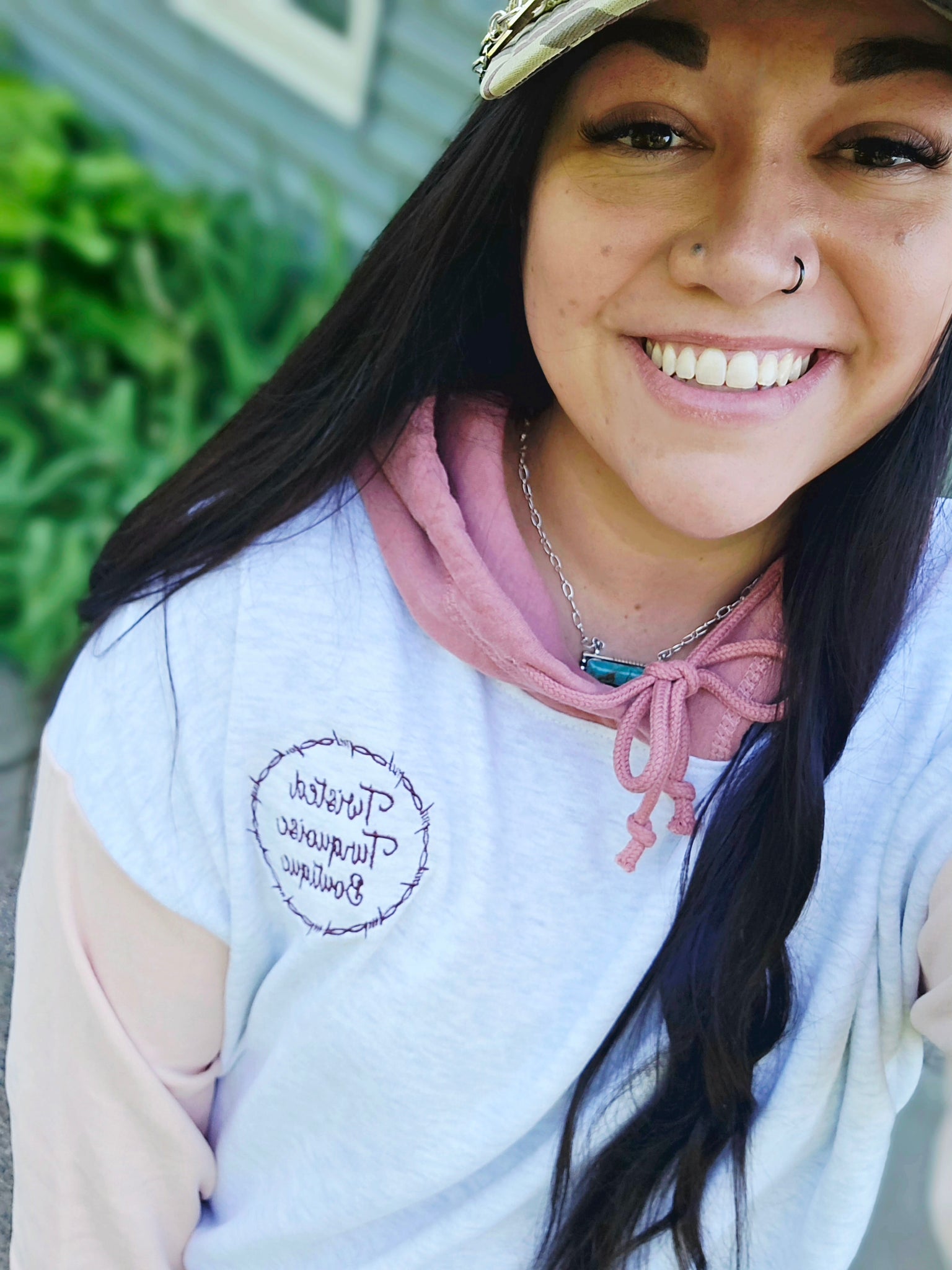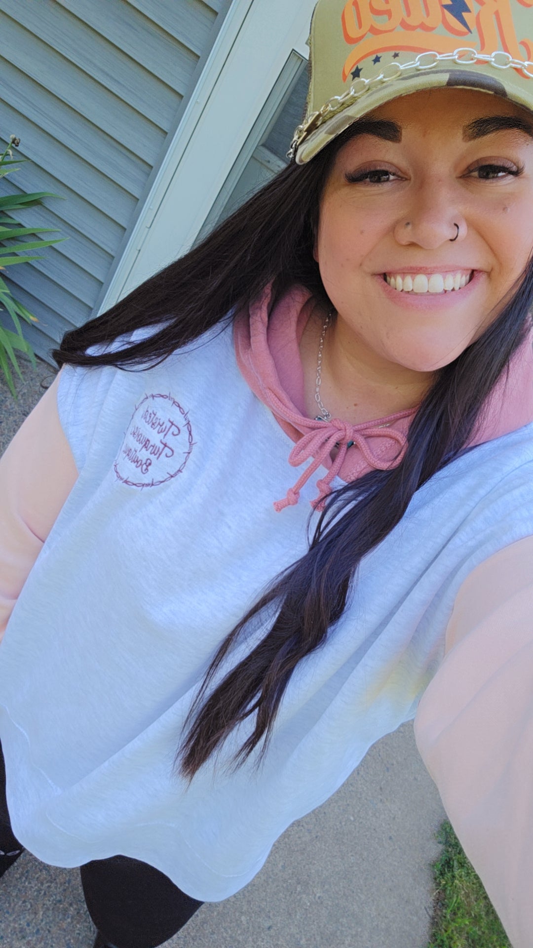 Color: Multicolor gray hoodie, with pink block sleeves.