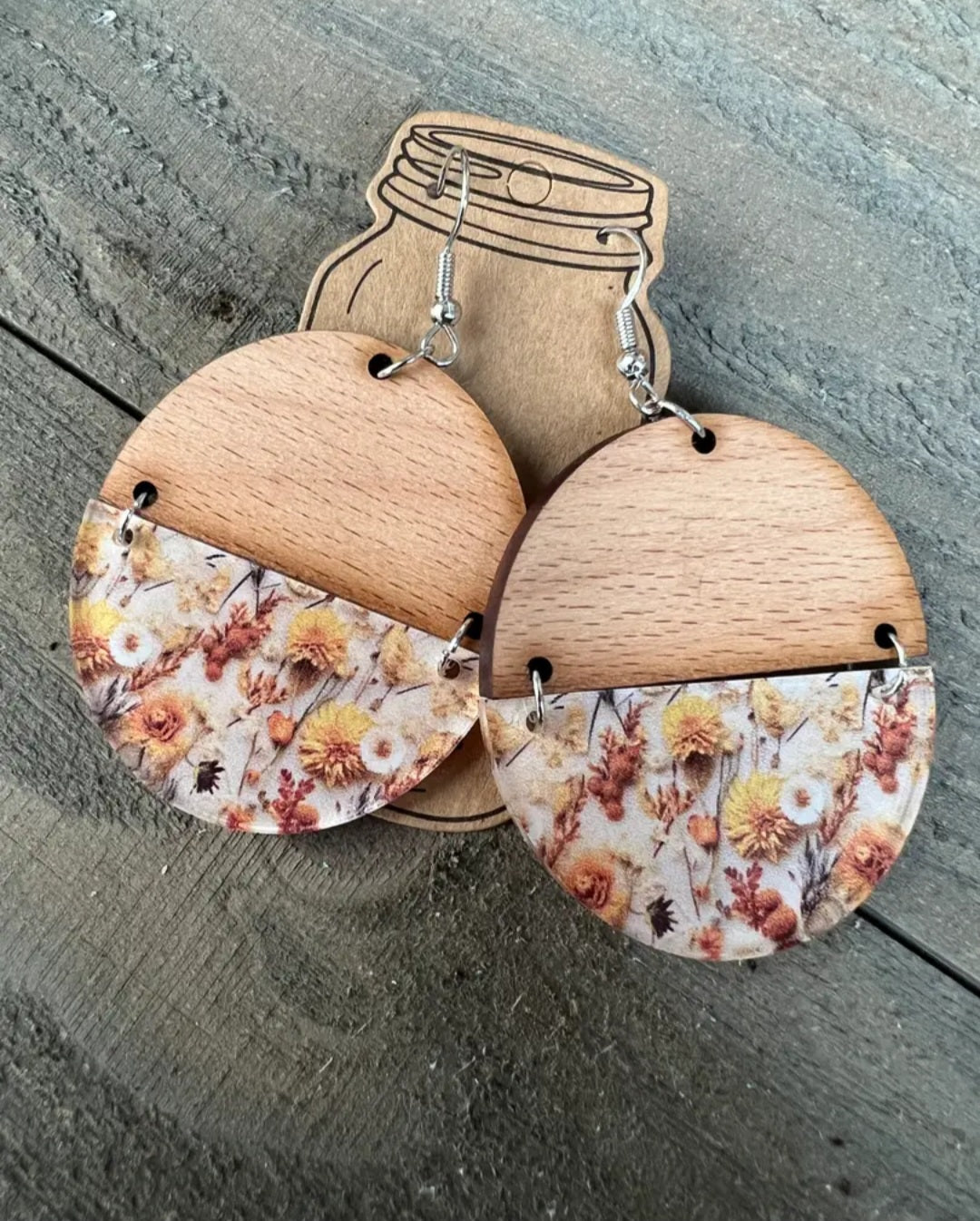 These hand made earrings are half wood half acrylic.