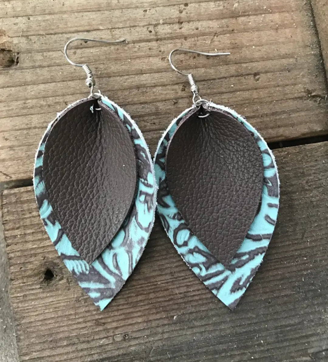 Landyn Double Layered Tear Drop Earrings Hand crafted. Double layered teardrop earrings. Genuine Leather, fish hook style with rubber backing. Nickel free ear wire. 2.5" Length 1.5" Width 3.5" Drop Length Color: Turquoise Tooled, with Brown Inlay...Read more